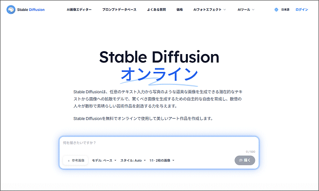 拡散モデルの一種であるLatent Diffusion Modelを採用しており、ランダムなノイズから段階的に画像を構築します。写実的な写真表現からアニメ風のイラストまで幅広い表現に対応し、無料で利用できる点も特徴です。